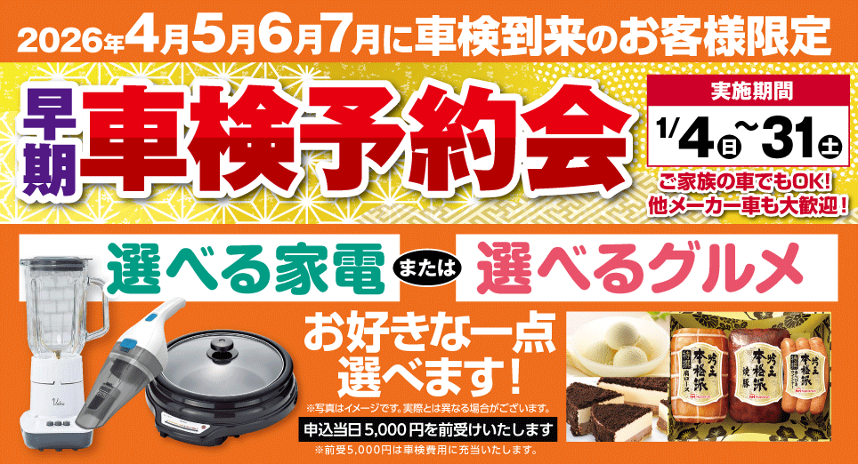 • 早期車検予約会1/4(日)~31(土)2026年4月・5月・6月・7月 車検到来のお客様限定