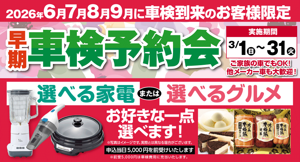 • 早期車検予約会3/1(日)~31(火)2026年6月・7月・8月・9月 車検到来のお客様限定